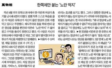 조선일보는 <"빈 영상만 올렸는데 2분만에 노란딱지" 보수 유튜버 반발>(10/22, 윤수정, 강다은 기자)에서 친문 네티즌들이 보수 유튜버들을 신고하는 캠페인을 벌이고 있어 보수 유튜버들에게 노란딱지가 쏠렸다고 주장했습니다.