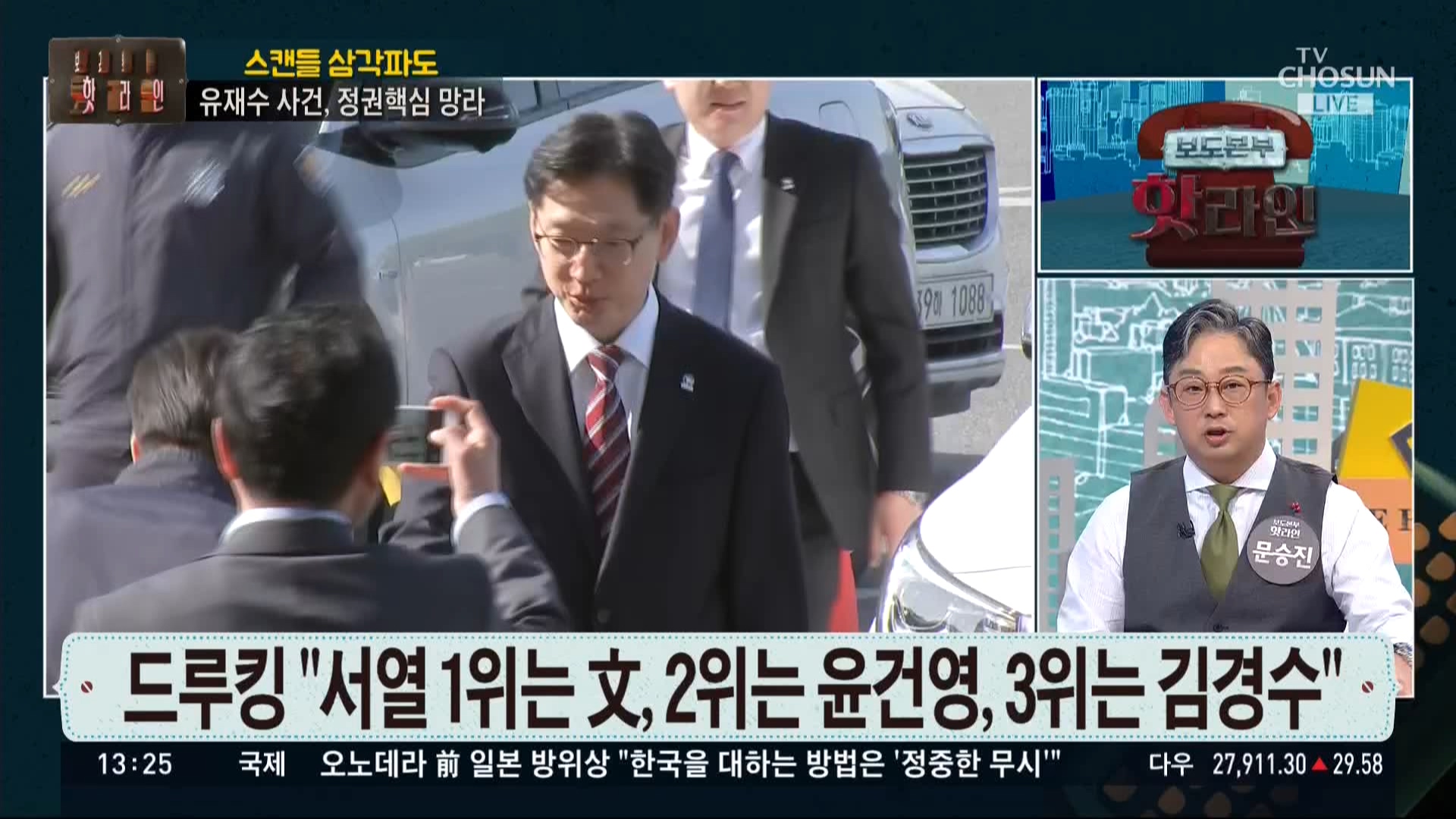 TV조선 <보도본부 핫라인>(2019/12/12)은 김기현 전 울산시장 측근 비리 하명수사 의혹, 유재수 전 부산시 경제부시장 감찰 무마 의혹과 관련된 대담을 진행했습니다. TV조선은 이 과정에서 정권의 실세를 언급하며 그 근거로 드루킹의 발언을 소환했습니다.