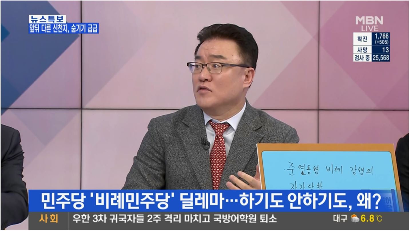MBN <뉴스와이드>(2/13)에 출연한 서정욱 변호사는 미래통합당의 위성정당 미래한국당이 “준연동형비례제 자체가 일방적인 강행처리니까 거기에 대한 정당방위”라고 주장했습니다. 이어 더불어민주당의 위성정당 창당 논란을 다룬 27일 방송에서는 당시 자유한국당이 위성정당 창당을 사전에 공언했으니 문제 될 것 없다며 자유한국당(미래통합당) 대변인도 울고 갈 논리를 펴기도 했습니다.