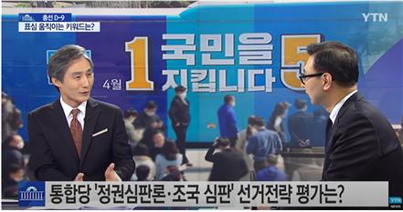 △ 방송 백화면에 더불어민주당과 더불어시민당의 공동 유세 버스 사진을 배치한 YTN. 선방심의위는 ‘권고’를 의결했다.