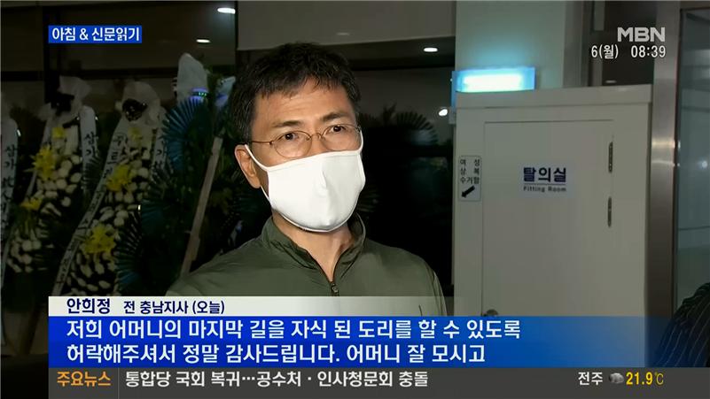 MBN <아침&매일경제>(7월 6일)는 안희정 씨 범죄를 명확하게 소개하지 않은 채 계속해서 ‘안 전 지사’로 호명하고, 일시 석방을 받아 장례식장으로 들어가는 안 씨에게 마이크를 내밀었습니다. 성범죄를 저지르고 복역 중인 안 씨에게 발언권을 준 것이죠.