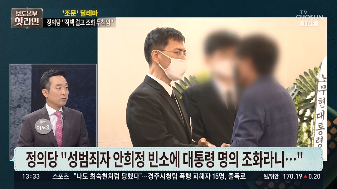 이도운 문화일보 논설위원 : 정의당의 그 지적이 타당한 측면도 있는 것 같습니다. 그러니까 인간적으로 위로를 하기 위해 보낸 거니까 직함을 떼고 이름만 했어도 괜찮지 않을까, 그런 생각을 뭐, 공감 가는 그 측면이 있습니다. 그런데 이제 안희정 전 지사의 상가는 아무래도 정치인이기 때문에 옳고 그름, 아까 정의당이 이야기하는 지적이나 이런 성인지 감수성 이런 걸 떠나서 사실은 정치적으로 볼 측면도 있는 것 같습니다. 그 점은 또 짚고 넘어가야 할 거 같은데 예를 들어서 만약에 보수진영에 안희정 전 지사와 비슷한 처지에 있는 분이 상을 당했다면 아마 그 상가에 얼마나 많은 통합당이나 보수 진영 인사가 갔을까요? 저는 저렇게 많이 가지 않았다고 봐요.