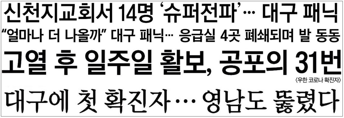 △ 대구경북 신천지발 대규모 확산 시점에 과장된 표현 사용한 동아일보, 한국일보, 조선일보, 매일경제 기사 제목
