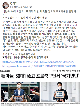 조선일보는 제기된 의혹에 관해 “인턴채용 과정을 정밀하게 규명해야 한다”는 야당 국회의원의 발언을 인용했을 뿐, 채용과정에서 특혜를 의심할 수 있는 근거에 대한 취재내용은 찾을 수 없습니다. 다음 날인 9월 11일 김예지 의원은 페이스북에 조선일보 기사 캡쳐본, 링크 주소와 함께 “서씨가 카투사 복무 때도 추 장관 측이 수시로 민원전화를 했다는 정황이 드러난 만큼, 채용과정도 살펴봐야 합니다. 조선일보 기사 일부분입니다”라는 글을 올렸습니다. 조선일보는 김예지 의원실에서 제공받은 자료를 바탕으로 근거 없는 의혹보도를 하고, 김예지 의원실은 조선일보 기사를 인용하며 자신의 주장에 힘을 실은 꼴입니다.
