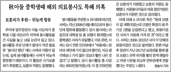 조선일보는 추 장관 아들의 휴가 관련 의혹이 제기되자 특혜로 볼 만한 여지가 없는 것까지 특혜로 만드는 보도를 내놨습니다. 9월 15일 <추아들 중학생때 해외 의료봉사도 특혜 의혹>(양승식 기자)에서 “봉사활동 주관단체가 발대식 직전 발표한 ‘봉사단 명단’에는 서씨의 이름이 없는데, 실제 봉사활동에는 서씨가 뒤늦게 합류했기 때문이다. 이 활동은 국가보훈처가 후원했고, 보훈처 직원도 동행했다”는 점을 들어 의혹을 제기했습니다. 하지만 보훈처가 후원했다는 사실과 서 씨가 마지막으로 합류했다는 점이 왜 서 씨에 대한 특혜를 의심할 만한 대목인지에 대한 근거는 설명되지 않았습니다.