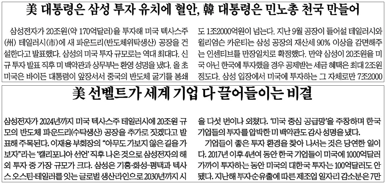 삼성전자 미국공장 선정, ‘이재용 부회장 심경’ 제목에 뽑힌 이유조선일보·한국경제 ‘전략 없이 친노조정책’ 정부 비판