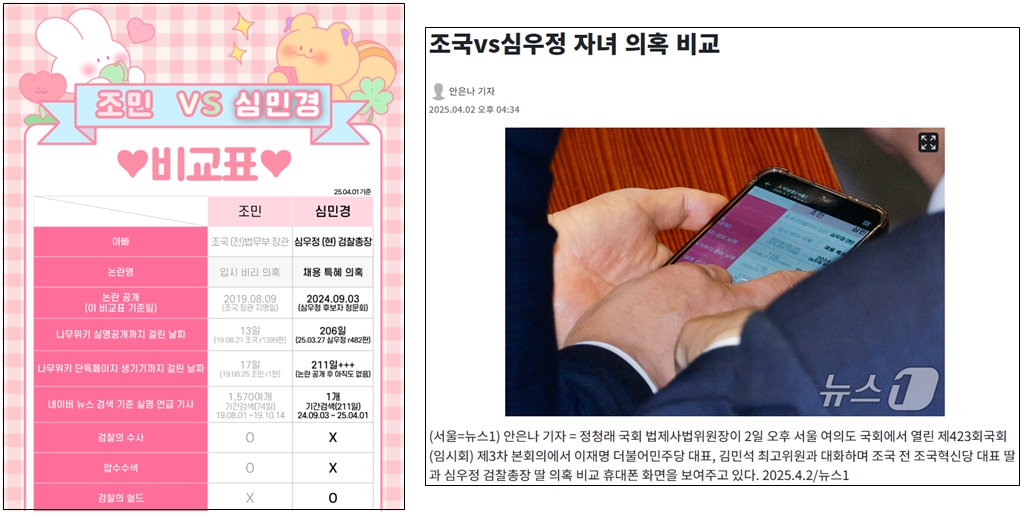 딴지일보에 올라온 <조민 vs 심우정 딸 심민경 비교표 (기간검색 실명기사 전부 캡쳐)>(4월 1일)는 단시간에 공감을 얻으며 각종 소셜미디어를 타고 퍼졌습니다. 다음 날인 4월 2일 국회에서 정청래 법제사법위원장이 이재명 더불어민주당 대표, 김민석 최고위원과 함께 비교표를 살펴보는 모습이 언론에 포착되기도 했습니다(뉴스1 <조국vs심우정 자녀 의혹 비교>(4월 2일 안은나 기자)).
