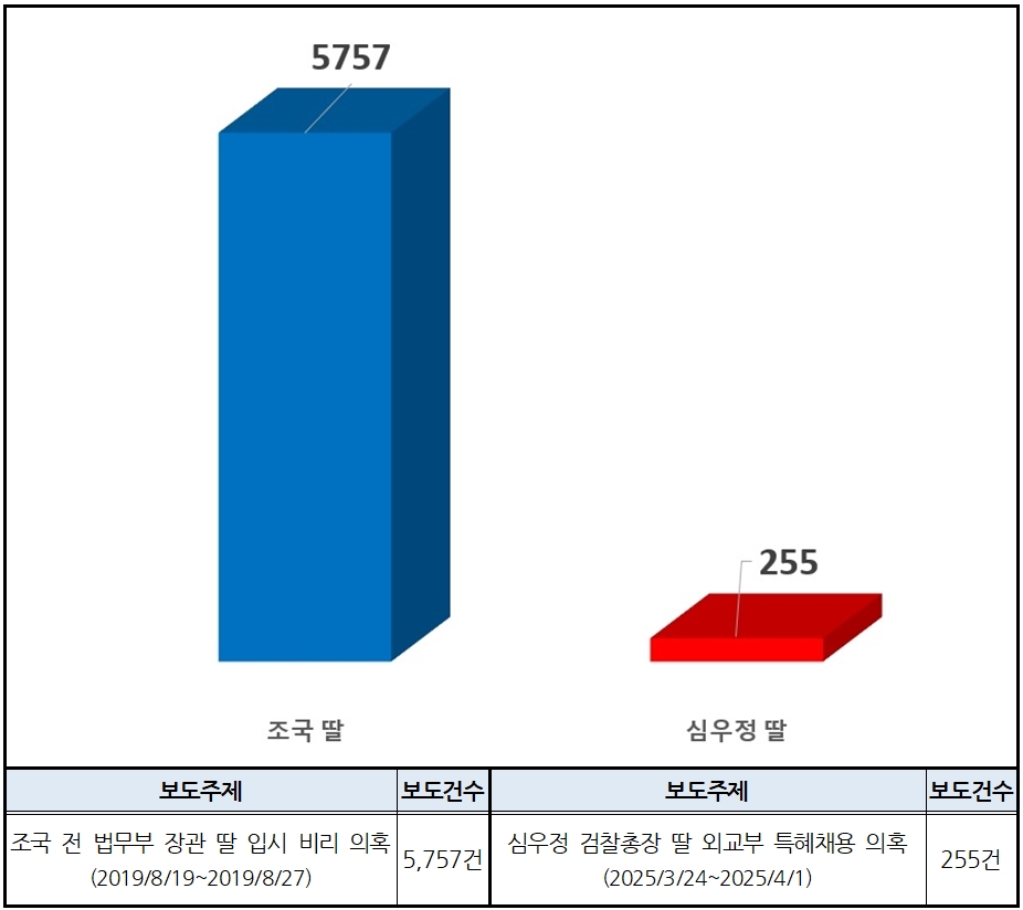 조국 전 법무부 장관 딸 의혹은 전체 5,757건으로 하루 평균 640건 보도됐습니다. 심우정 검찰총장 딸 의혹은 전체 255건으로 하루 평균 28건 보도됐습니다. 약 23배 차이입니다. 또한 조 전 장관 딸 의혹을 전하며 딸의 실명을 공개한 보도는 20건인데 반해, 심 총장 딸 의혹을 전하며 딸의 실명을 공개한 보도는 1건도 없습니다. ‘고위공직자 자녀 특혜 의혹’이라는 본질은 동일한데 전체 보도건수와 자녀 실명 공개 보도건수에서 엄청난 차이를 보인 것입니다.