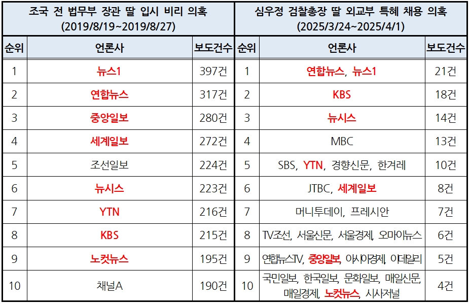 2025년 1월 8일 기준 포털사이트 네이버 뉴스 ‘언론사 편집판’ 구독자 수 200만 이상인 49개 언론사를 대상으로 ① 2019년 8월 19일부터 27일까지 키워드 ‘조국 딸’로 검색한 기사 전체 ② 2025년 3월 24일부터 4월 1일까지 ‘심우정 딸’로 검색한 기사 전체