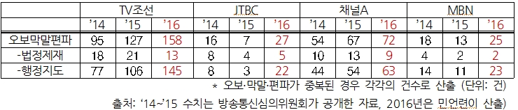 민언련이 산출한 2016년 오보․막말․편파방송도 여전히 늘어나