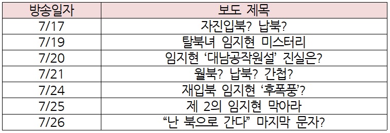 날짜별로 정리한 아래 표를 보면 종편 3사가 얼마나 빈번하게 임 씨에 대해 보도를 했는지 한눈에 알 수 있는데요, 7월 17일부터 8월 2일까지 보름이 넘는 기간 동안 임지현 씨 재입북 관련 뉴스를 다루지 않은 날이 없습니다.