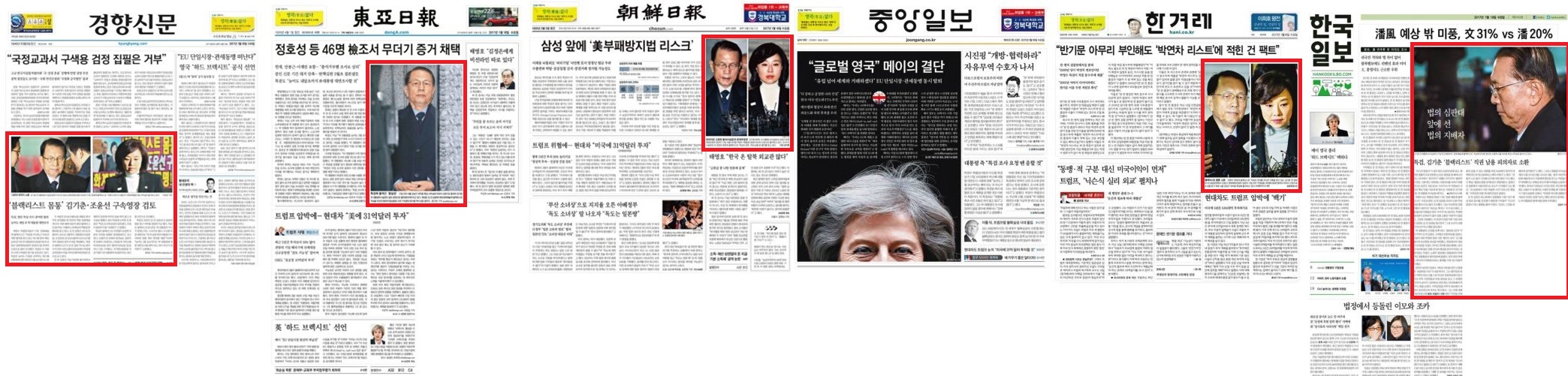 이날 경향신문은 <‘이번엔 어물쩍 안돼’ 촛불 민심에 ‘국가경제 기여 논리’ 설득력 잃어> 보도를 통해 “일반 시민들의 시선”이 “특검의 칼날만큼이나 차갑다”며 여론을 전달했습니다. 한국일보는 <‘선수 명단’은 서로 감춘 채… 특검․삼성, 창과 방패의 신경전> 등의 기사를 통해 “양측은 선수들의 명단도 비밀에 부쳤다”고 말하는 등, 특검과 삼성의 상황을 마치 스포츠 중계를 하듯 전달하는 방식을 택했습니다.