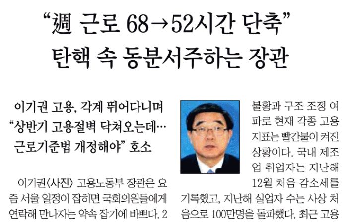 1면 우상단에 배치된 조선일보의 <주 근로 68→52시간 단축 탄핵 속 동분서주하는 장관>(1/19 https://goo.gl/1VIFhi) 기사는 “이기권 고용노동부 장관은 요즘 서울 일정이 잡히면 국회의원들에게 연락해 만나자는 약속 잡기에 바쁘다. 2월 임시국회에서 근로기준법 개정안을 통과시켜 달라는 부탁을 하기 위해서다”라는 문장으로 시작됩니다. 이어지는 내용도 이 장관이 노동 개혁 4법 처리에 반대한 야권 인사를 “시간을 쪼개”가며 만나고 “절박”하게 근로기준법 개정안의 조속한 처리를 호소하고 있다는 것을 전달하고 있지요. 그러면서 조선일보는 “이 장관이 근로기준법 개정을 위해 동분서주하는 것은 올 상반기에 닥칠 ‘고용 절벽’ 때문”이라 소개하기도 했습니다. 이후에도 이 장관의 ‘호소’ 행보 소개는 계속 이어집니다.
