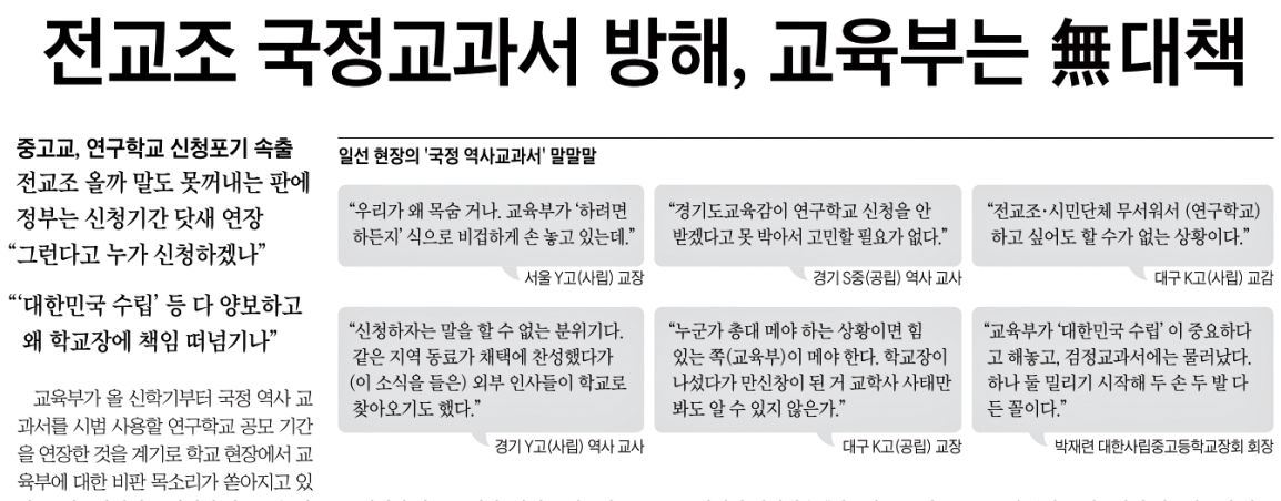 가산점과 예산지원 약속에도 불구하고, 9일 현재까지 교육부의 국정 역사교과서 ‘연구학교’를 신청한 학교가 단 한 군데도 없다고 합니다. 최종본마저 오류가 수백 개 발견되는 등 부실제작 논란이 이어지고 있는 국정 역사교과서를 교육현장이 외면하는 것은 어쩌면 당연한 일이겠지요. 그런데 조선일보는 이 문제의 책임을 모두 전교조에 떠넘겼습니다.