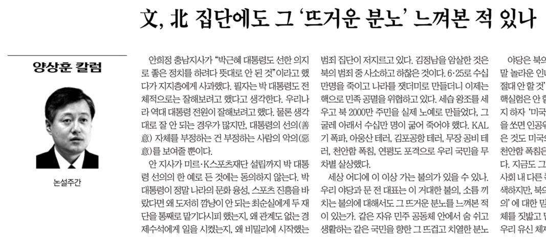 조선일보 양상훈 논설주간의 <양상훈 칼럼/문, 북 집단에도 ‘뜨거운 분노’ 느껴본 적 있나>(2/23, https://goo.gl/BB4Ip1)는 이 두 가지 논리를 아주 잘 버무려 놓은 칼럼입니다. 양 주간은 먼저 “안 지사의 ‘선의’ 발언보다 문재인 전 대표가 ‘안 후보의 선의 발언에 분노가 빠져 있다’고 한 말이 더 마음에 걸”린다며 “문 전 대표 말대로 불의에 대한 뜨거운 분노 없이 세상은 좋아지지 않는”는다고 운을 띄웠습니다. 그런데 “지금 대한민국과 5000만 국민, 남북한 7000만 민족에게 최대, 최악의 불의는 북의 폭력 범죄 집단이 저지르고 있”으며 “세상 어디에 이 이상 가는 불의가 있을”수 없음에도 “김정남 독살을 두고 ‘불가피한 일’ ‘일어날 수도 있는 일’이라고 한 사람을 국정자문단 공동위원장 자리에 그냥 두”는 것을 보아, “우리 야당과 문 전 대표”가 “이 거대한 불의, 소름 끼치는 불의에 대해서도 그 뜨거운 분노를 느껴본 적이 있는”지 의심스럽다는 것이죠.