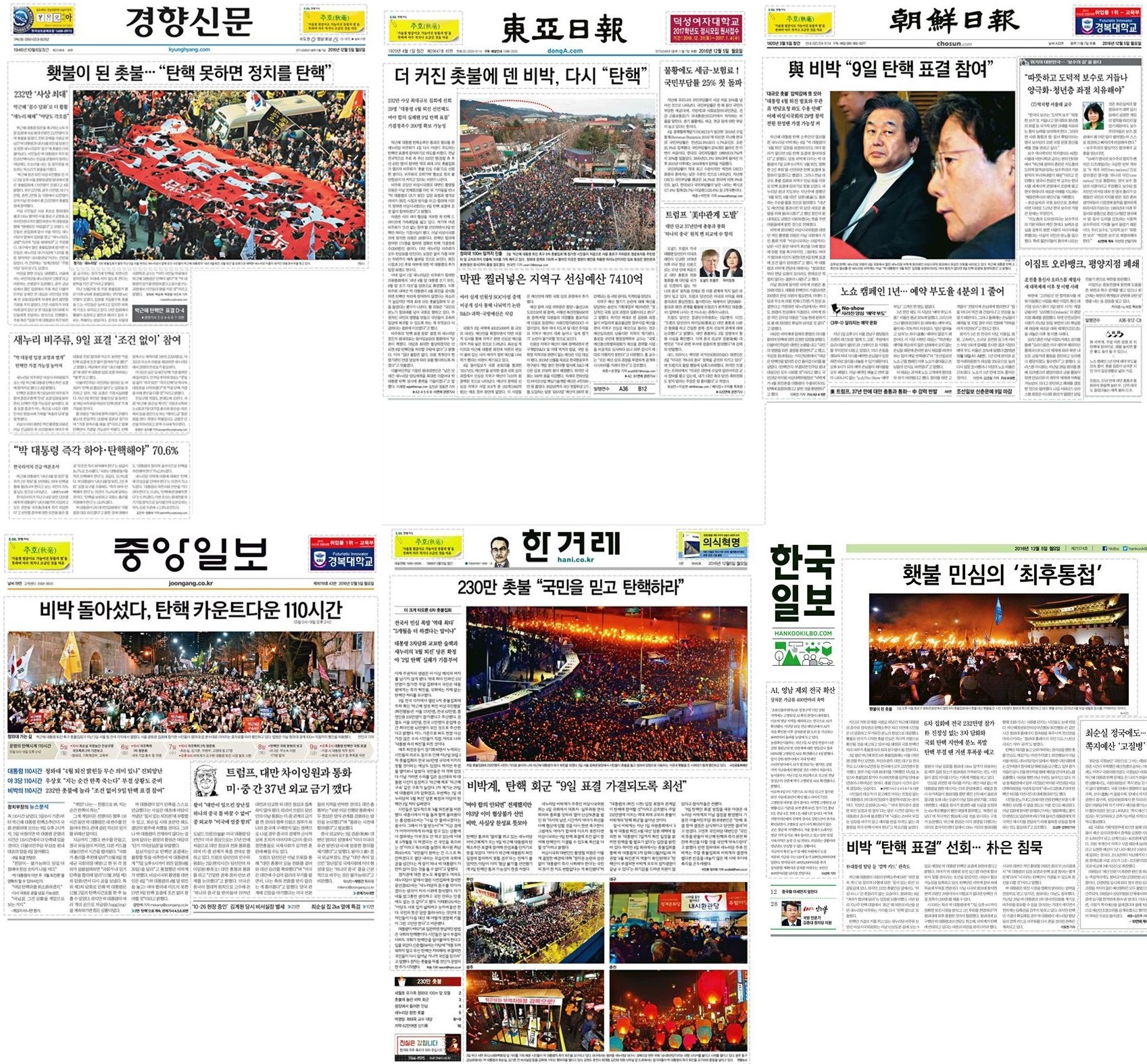 3일 6차 주말 촛불집회가 전국 각지에서 열렸습니다. 참가 인원은 주최 측 추산 서울 170만명, 전국 232만명에 달했습니다. 아래는 각 매체의 입장을 대표 코멘트로 정리한 것입니다. 참고로 5일 지면에 촛불집회 현장 사진을 싣지 않은 것은 조선일보 뿐입니다. 1면에 관련 보도도 없었고, 관련 사설도 내놓지 않은 것을 보아 슬슬 ‘집회와 거리두기’에 나서려는 것 아닌가 싶네요.