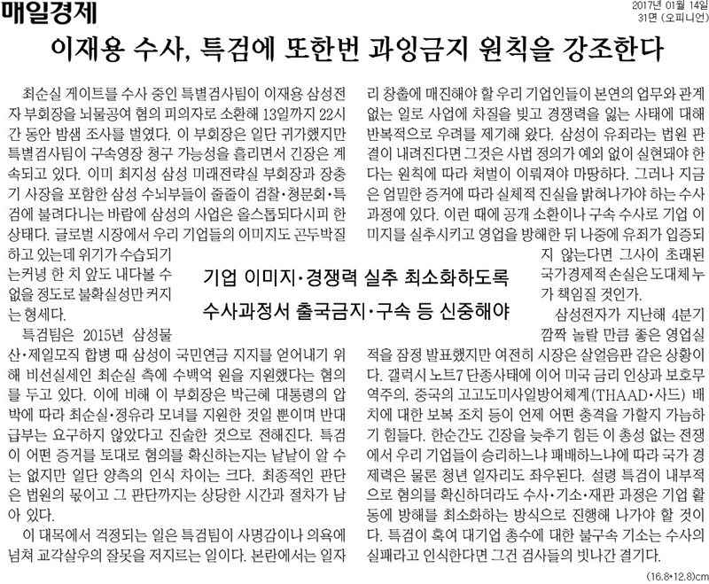 KBS의 이런 태도는 본격적으로 ‘이재용 살리기’에 나선 일부 경제지의 입장과 정확히 일치해 우려를 사고 있습니다. 매일경제는 14일 <사설/이재용 수사 특검에 또한번 과잉금지 원칙을 강조한다>에서 “삼성전자가 지난해 4분기 깜짝 놀랄 만큼 좋은 영업실적을 잠정 발표했지만 여전히 시장은 살얼음판 같은 상황” “갤럭시 노트7 단종사태에 이어 미국 금리 인상과 보호무역주의, 중국의 고고도미사일방어체계(THAAD·사드) 배치에 대한 보복 조치 등이 언제 어떤 충격을 가할지 가늠하기 힘들다”라고 주장해 KBS와 비슷한 주장을 펼쳤습니다.
