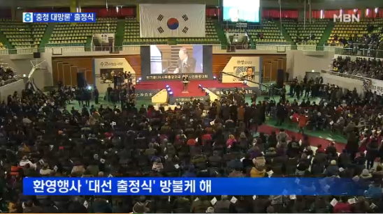 △ 체육관에 2000면 모인 ‘반기문 환영식’과 국회 헌정기념관에 300명 모인 ‘문재인 지지 모임’을 똑같은 ‘대선 출정식’으로 묘사한 MBN(1/14)