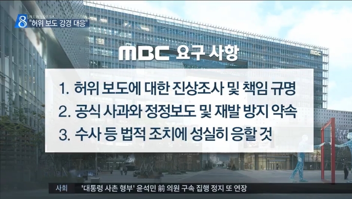 그러자 MBC가 13일, 자사 저녁종합뉴스 ‘뉴스데스크’로 두 매체에 대한 선전포고를 내렸습니다. MBC <“편의적 단정으로 허위 보도”…공식 대응>(1/13 https://bit.ly/2iSq26z)은 “근거 없는 허위보도로 문화방송 뉴스 브랜드와 사장의 명예를 심각하게 훼손한 TV조선과 미디어오늘에 대해 MBC가 공식대응에 착수했습니다. 거짓보도와 이를 확대 유포하는 구조를 근절시키기 위해서입니다”라고 엄포를 놓았습니다. TV조선과 미디어오늘 보도를 무조건 ‘허위 뉴스’라 규정한 김태래 기자는 “허위보도에 대한 회사 차원의 진상조사와 책임 있는 규명. 즉각적인 공식사과와 정정보도 그리고 재발방지를 약속할 것. 그리고 향후 진행될 수사 등 법적 조치에 성실히 응할 것” 등 자사의 요구사항까지 전달했고 “다른 매체에 자사 보도가 확산되도록 허위의 사실을 알리는 등 선정적인 목적으로 MBC의 피해를 가중시켰다” “TV조선의 허위 보도 이후 민주노총 산하 언론노조의 기관지 격인 미디어오늘은 기다렸다는 듯이 MBC 안광한 사장의 실명을 제목으로 뽑아 기사를 게재”했다며 TV조선과 미디어오늘을 맹비난했습니다.