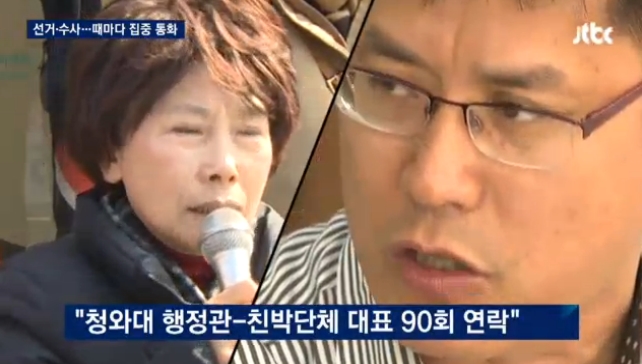 JTBC는 이에 그치지 않고 <선거‧수사…때마다 집중 통화>(3/6 https://bit.ly/2mWRvX4)라는 보도를 더해 “허현준 청와대 국민소통비서관실 행정관이 주옥순 엄마부대 대표와 통화, 문자메시지 등을 90여 차례 주고받은 것”, “이들이 지난해 1월부터 이른바 '태극기 집회'가 열린 올해 1월 초까지 연락을 취한 것” 등 특검이 밝힌 ‘관제데모 정황’더 전했습니다. 허현준 행정관은 JTBC의 ‘어버이연합 게이트’에서도 추선희 어버이연합 총장 등 친박단체 관계자들에게 관제데모를 요구했던 인물입니다. 특검에 따르면 “90여 차례 연락 중 절반은 4·13 총선을 앞둔 지난해 3, 4월에 집중적으로 이뤄졌”고 “지난해 11월 초 최순실 씨가 검찰에 출석한 직후 검찰 수사 주요 국면마다 허 행정관과 주 대표 사이에 통화가 있었던 사실”도 있었다고 합니다.