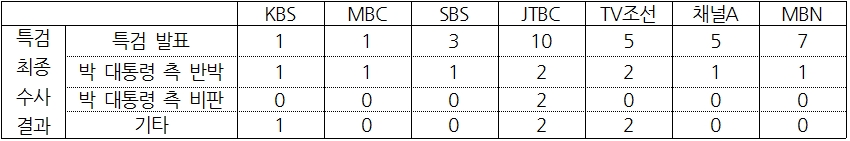 한편, KBS와 MBC는 특검의 발표와 박 대통령 측 반박을 똑같이 1건 보도하면서 같은 비중을 뒀습니다. KBS는 여기다 ‘여야 정치권 반응’을 1건 덧붙였을 뿐입니다. 타사가 모두 특검의 수사결과에 훨씬 더 큰 비중을 둔 것과 대조됩니다. 특검이 밝힌 박 대통령 혐의와 그에 대해 ‘사실 무근’, ‘정치 특검’ 등 기존의 입장을 반복한 대통령 입장을 똑같은 비중으로 처리한 것도 납득하기 어렵습니다.