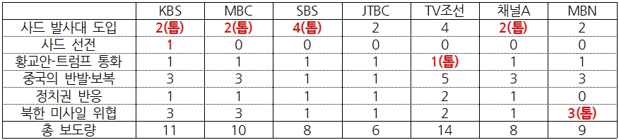 JTBC를 제외한 6개 방송사는 모두 사드 관련 보도를 10건 남짓 내면서 상당한 비중을 할애했습니다. 그 내용을 요약하자면 6일 북한이 탄도미사일 4발을 발사하는 등 북한의 핵‧미사일 위협이 고조되고 있고 이 때문에 한미 양국이 사드 배치를 서둘렀다는 겁니다. 이는 우리 국방부의 입장과 하등 다를 바가 없습니다. 이렇게 국방부의 입장을 정당화해주는 방식도 가지각색입니다. 6개 방송사가 내세운 톱보도를 보면, 지상파 3사와 채널A는 사드 발사대 조기 도입을 톱으로 낸 다음 북한의 핵‧미사일 위협을 이어 붙인 반면, TV조선과 MBN은 북한의 미사일 위협을 먼저 톱보도로 강조한 후 사드 조기배치를 보도했습니다. 순서만 다를 뿐, 결국 말하고자 하는 바는 같습니다.