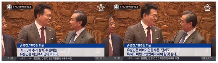 채널A <김승련의 뉴스TOP10>(1/5)는 이정훈 씨의 발언만이 문제되는 것이 아닙니다. 이날 방송은 “사드에 대해서 굴욕외교를 하고 왔다”는 유승민 바른정당 의원의 발언을 보여주더니, 이 발언에 반박한 송영길 의원의 발언을 전했습니다. 문제는 그 발언 중 “사드 3개 추가 설치 주장하는 유승민은 대선주자급이 아니다”, “유승민은 어버이연합 수준, 단세포, 록히드 마틴 대변인이라 해야 할 것 같다” 등 일부 자극적 문구만 자막으로 뽑았다는 것입니다. 실제 송영길 의원은 “국익을 위해 노력하는 방법론상의 차이를 적대시하고 매국으로 비난하는 것은 대선주자로 거론되는 정치인으로서 수준 낮은, 성숙하지 못한 모습”, “결국 유승민 의원이 자신의 뿌리가 박근혜 라는 한계를 버리지 못하는 것 같아 안타깝다. 뒤에 숨어서 비난하지 말고 정정당당하게 공개토론 할 것을 제안한다”라고 말했지만, 이는 전혀 언급되지 않았습니다. 자극적인 발언만 골라 내보내서 야당 의원에 대한 부정적 인식을 강화시킨 셈이죠.