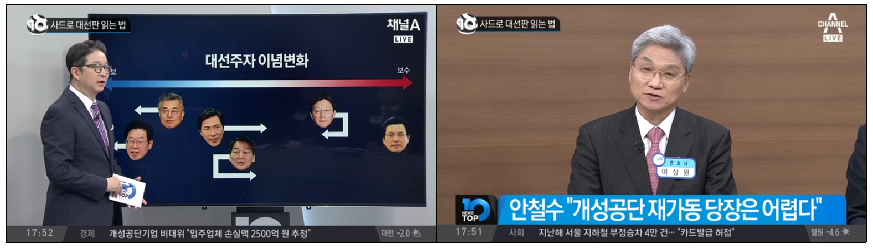채널A <김승련의 뉴스TOP10>(2/10)에서는 대권주자들의 정치성향 분석이 있었습니다. ‘사드로 대선판 읽는 법’라는 코너였는데요. 고고도미사일방어체계(THHAD·사드) 한국 배치, 개성공단 폐쇄에 대한 대권주자들의 입장변화를 가지고 대권 판도를 분석하는 시간이었습니다. 방송은 ‘대권주자 이념변화’라며 그림까지 준비했고 출연자들은 ‘트럼프 정부의 북핵 견제’, ‘외생 변수인 국제 외교 문제를 신경 쓴 것’ 등의 분석을 내놨습니다. 그런데 여상원 변호사는 “저분들(진보 대권 주자들)이 국제협약을 존중하고 뭐 미국과 약속을 존중하기에 돌아선 것? 저분들은 오히려 진보 쪽의 사람들은 미국과의 약속은 오히려 깨면 깰수록 그게 어떤 내국적이고 민족 자주적이라고 생각하기 때문에 그런 깬다는 말을 듣고도 자기들 표에 유리하면 결코 보수 쪽으로 돌아오지 않을 분들이거든요. 그래서 제가 볼 때는 어떤 외국과의 약속 이런 것을 갖다가 생각하기보다는 아까 말씀드린 대로 득표 전략이 아닌가, 그렇게 생각합니다”라고 주장했습니다.
