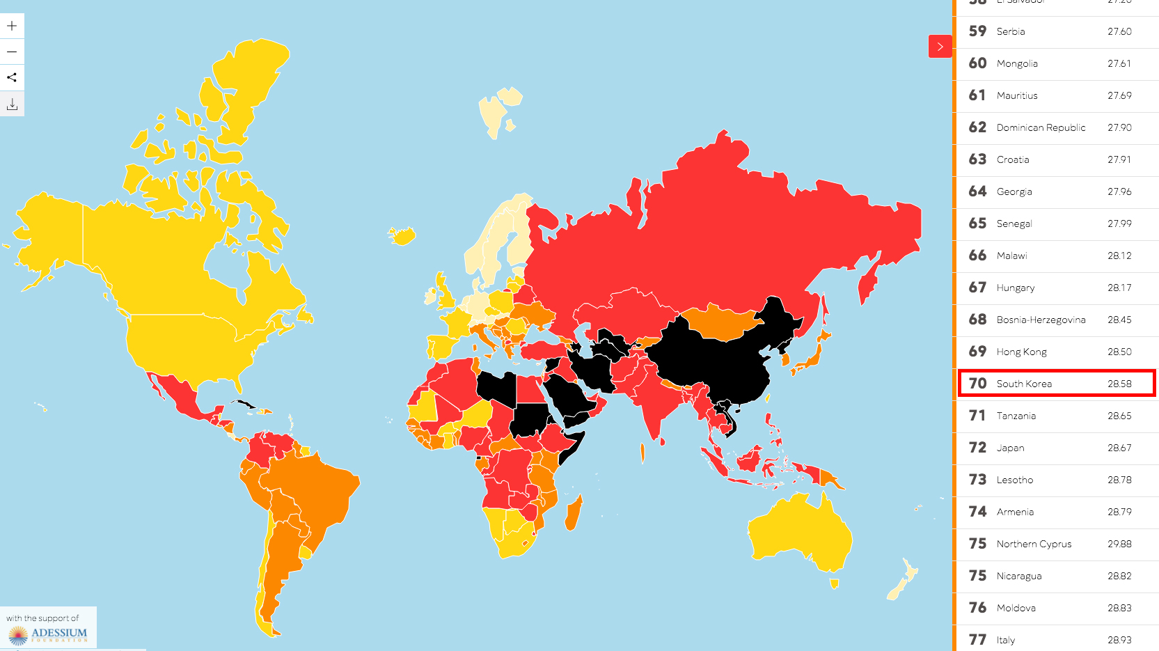 △ 이명박근혜 정권 하에서 한국의 언론자유는 크게 추락했다. 파리의 언론자유 감시단체 <국경없는 기자회>에 의하면, 세계 1백80개 국가 중에서 한국은 2007년에는 31위였던 언론자유지수가 2016년에는 70위로 크게 떨어졌다. 사진은 국경없는 기자회 홈페이지에 발표한 2016년 언론자유지수. (사진 : rsf.org)
