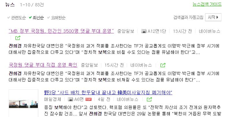 △ 국정원 TF 발표에 대한 자유한국당 전희경 대변인의 ‘정치보복’ 발언 검색 결과(8/4)
