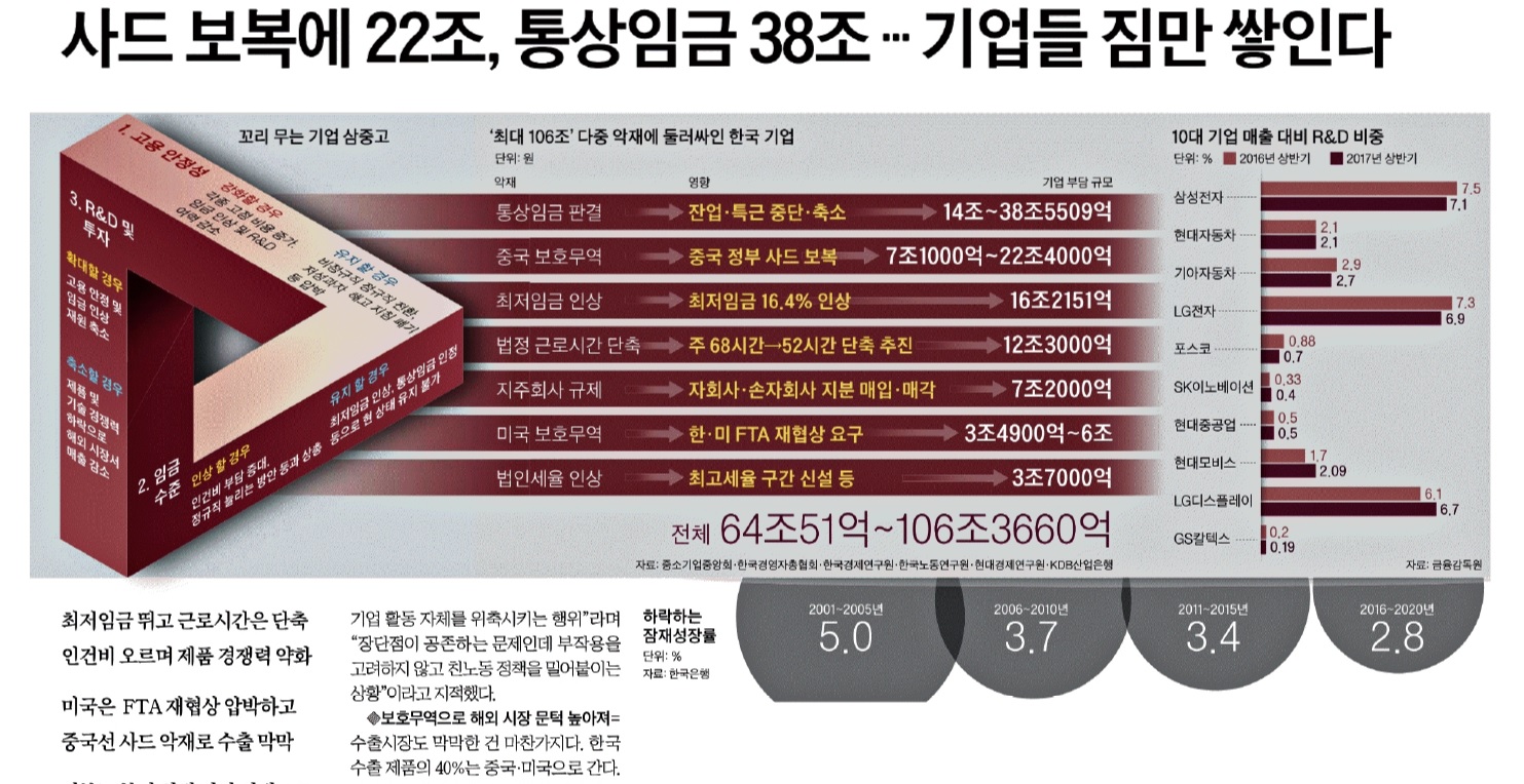 중앙일보의 ‘기업 편들기’는 <사드 보복에 22조, 통상임금 38조… 기업들 짐만 쌓인다>(9/26 문희철․이소아 기자 https://bit.ly/2htVXhT)에서 더욱 도드라졌습니다. 기사는 “재계에선 세계시장에서의 경쟁 심화로 산업 경쟁력은 약화하고 있는 상황에서 정부가 각종 부담을 기업에 떠넘기고 있다는 지적이 나온다”면서 “주요 기업들이 ‘고용 안정’ ‘임금 인상’ ‘투자 증대’라는 삼중고(트릴레마)에 시달리는게 대표적이다”며 기업의 고충을 언급했습니다. 특히 ‘인건비 부담’을 이야기하면서 “하지만 올해 인건비를 밀어올리고 노동 유연성을 악화시키는 일만 잔뜩 벌어졌다. 내년 최저임금(7530원)을 올해보다 16.4% 올리면서 16조 2151억 원의 인건비가 늘었다”고 보도했습니다. 김병도 서울대 경영학과 교수가 “최저임금·근로시간·통상임금 등 현재 정부 정책은 소득을 분배하겠다는 것이 아니라 기업 활동 자체를 위축시키는 행위” “장단점이 공존하는 문제인데 부작용을 고려하지 않고 친노동정책을 밀어붙이는 상황”이라고 발언한 내용도 인용되었습니다.